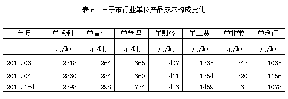 從單位產(chǎn)品成本構(gòu)成變化情況看,2012年1-4月份我國(guó)簾子布行業(yè)中相對(duì)于每噸簾子布產(chǎn)量而言,其單毛利為2798元/噸,單營(yíng)業(yè)(單位產(chǎn)品的營(yíng)業(yè)費(fèi)用)為298元/噸,單管理(單位產(chǎn)品的管理費(fèi)用)為734元/噸,單財(cái)務(wù)(單位產(chǎn)品的財(cái)務(wù)費(fèi)用)為426元/噸,單三費(fèi)為1459元/噸,單非常(單位產(chǎn)品的非經(jīng)常性損益)為262元/噸,單利潤(rùn)(稅前利潤(rùn))為1078元/噸,如果剔除非經(jīng)常性損益的影響,單位產(chǎn)品的名義稅前利潤(rùn)為1340元/噸。