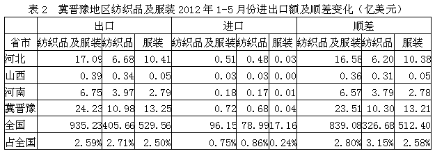 我國冀晉豫三省2012年1-5月份紡織品及服裝出口額為24.23億美元,占全國紡織品服裝出口總額的2.59%,其中紡織品出口額為10.98億美元,占全國2.71%,服裝出口額為13.25億美元,占全國2.50%;在進口方面,冀晉豫三省紡織品及服裝進口額為0.72億美元,占全國紡織品服裝進口總額的0.75%,其中紡織品進口額為0.68億美元,占全國0.86%,服裝進口額為0.04億美元,占全國0.24%;顯示我國冀晉豫地區(qū)紡織品服裝出口總額遠高于進口總額,順差明顯,表明該地區(qū)紡織品服裝在國際市場上競爭力較強。