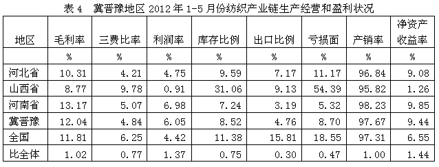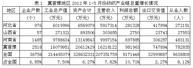 2012年1-5月冀晉豫紡織產(chǎn)業(yè)鏈經(jīng)濟運行分析