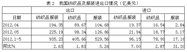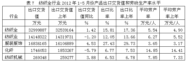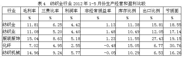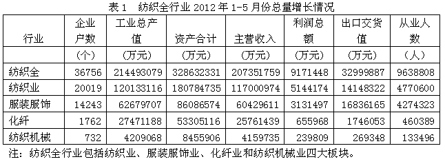 2012年1-5月紡織全行業(yè)經(jīng)濟(jì)運行分析