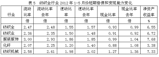從短期償債和變現(xiàn)能力的變化看,紡織全行業(yè)流動比率(流動資產(chǎn)/流動負(fù)債)2012年1-5月份為2.47倍,而上年同期為2.48倍,流動比率較高,表明企業(yè)短期償債能力較強(qiáng);