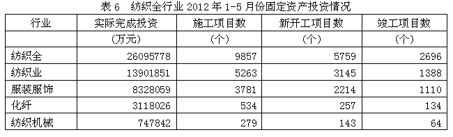 據(jù)國家統(tǒng)計局公布的數(shù)據(jù),2012年1-5月份紡織全行業(yè)實際完成投資額2609.58億元,同比增加18.53%;當(dāng)年以來到目前為止施工項目總數(shù)為9857個,同比減少9.02%;其中新開工項目數(shù)5759個,同比減少2.87%;截至5月底為止,已實現(xiàn)竣工項目數(shù)2696個,同比減少18.82%,占施工項目總數(shù)的27.35%,表明該行業(yè)投資項目進(jìn)展較好。