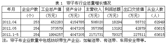 據(jù)國(guó)家統(tǒng)計(jì)局公布的數(shù)據(jù),2012年1-5月份我國(guó)規(guī)模以上簾子布行業(yè)上下游企業(yè)數(shù)量為254家,該行業(yè)實(shí)現(xiàn)工業(yè)總產(chǎn)值199.43億元,同比增加11.81%;資產(chǎn)合計(jì)404.72億元,同比增加11.12%;實(shí)現(xiàn)主營(yíng)收入217.17億元,同比增加11.88%;完成利潤(rùn)總額7.93億元,比上年同期增加0.30億元,同比增加3.98%;完成出口交貨值22.8億元,同比減少10.63%;行業(yè)整體從業(yè)人數(shù)6.36萬(wàn)人,同比減少6.57%。由此可見(jiàn),簾子布行業(yè)總量增長(zhǎng)勢(shì)頭良好,并為我國(guó)經(jīng)濟(jì)、財(cái)政、出口和就業(yè)作出了重大的貢獻(xiàn)。