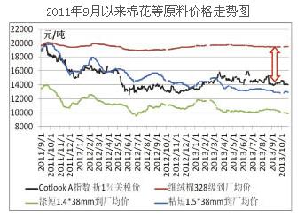 1~10月紗布產(chǎn)品價(jià)格指數(shù)走勢(shì)圖 根據(jù)調(diào)研了解,國(guó)內(nèi)中小紡織企業(yè)原料庫(kù)存相對(duì)少于大型企業(yè)。根據(jù)中棉行協(xié)9月跟蹤企業(yè)數(shù)據(jù)顯示,紡織企業(yè)棉花采購(gòu)有所下降,庫(kù)存環(huán)比減少。 棉花庫(kù)存減少主要包括幾方面原因:其一,7月底放儲(chǔ)結(jié)束已有一段時(shí)間,部分紡織企業(yè)前期購(gòu)買的儲(chǔ)備棉基本用完;其二,棉花收儲(chǔ)啟動(dòng)后,港口進(jìn)口棉銷售加快,市場(chǎng)資源緊缺;其三,儲(chǔ)備棉投放預(yù)期不明確,企業(yè)總體采購(gòu)積極性不高,小企業(yè)隨買隨用為主,庫(kù)存基本維持在1個(gè)月左右,資金相對(duì)寬裕的企業(yè)以觀望為主。 國(guó)內(nèi)外棉花價(jià)差擴(kuò)大 內(nèi)外棉花及棉紗價(jià)差仍然較大。2013年三季度,國(guó)內(nèi)棉價(jià)繼續(xù)大幅高于國(guó)際棉價(jià),并未延續(xù)年初以來小幅收窄的趨勢(shì),三季度價(jià)差平均為5132元/噸,較二季度相比每噸擴(kuò)大260元。截至10月22日,國(guó)內(nèi)棉花價(jià)格19515元/噸,國(guó)際棉花CotLookA指數(shù)價(jià)格89.4美分/磅。 巨大的國(guó)內(nèi)外棉價(jià)差導(dǎo)致了國(guó)內(nèi)棉紗價(jià)格同樣高于國(guó)際棉紗價(jià)格。2013年三季度,我國(guó)32支純棉普梳紗價(jià)格高于巴基斯坦同類產(chǎn)品約1000元/噸,高于二季度平均價(jià)差每噸500元左右;我國(guó)10支純棉轉(zhuǎn)杯紡紗高于印度同類產(chǎn)品1200元/噸,價(jià)差較二季度每噸擴(kuò)大300元左右。
