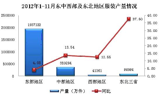 2012年1~12月,規(guī)模以上企業(yè)(簡稱:規(guī)上企業(yè))產(chǎn)量增速放緩,規(guī)模以下企業(yè)(簡稱:規(guī)下企業(yè))產(chǎn)量有所減少,服裝總產(chǎn)量與2011年基本持平。東部地區(qū)增速較慢,中西部地區(qū)增速較快,東北三省快速增長,產(chǎn)業(yè)呈現(xiàn)出由東部逐漸向其他地區(qū)轉(zhuǎn)移的趨勢。