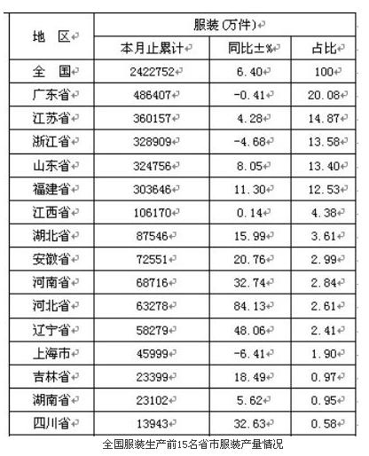 廣東、江蘇、浙江、山東和福建仍為我國服裝產(chǎn)量前五名大省,河北和遼寧產(chǎn)量同比增長較快。