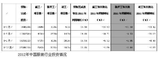 據(jù)國家統(tǒng)計局?jǐn)?shù)據(jù),2012年1~12月我國服裝行業(yè)規(guī)模以上企業(yè)實(shí)際完成投資2610.92億元,與2011年同比增長25.97%,增幅下降了15個百分點(diǎn)。2012年二到四季度新開工項(xiàng)目環(huán)比分別為156.82%、52.79%、28.19%,與2011年同比降幅收窄,顯示行業(yè)景氣度回升。
