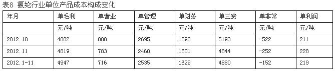 7氨綸行業(yè)單位產(chǎn)品經(jīng)營(yíng)狀況變化 從單位產(chǎn)品經(jīng)營(yíng)狀況變化情況看,2012年1-11月份我國(guó)氨綸行業(yè)中相對(duì)于每噸氨綸產(chǎn)量而言,其單收入(單位產(chǎn)品的主營(yíng)收入)為44316元/噸,單利息(單位產(chǎn)品的利息支出)為1383元/噸,單增值(單位產(chǎn)品的增值稅支出)為842元/噸,單賬款(單位產(chǎn)品的應(yīng)收帳款)為5094元/噸,單負(fù)債(單位產(chǎn)品的負(fù)債)為37740元/噸,單人工(單位產(chǎn)品的人工消耗)為14.01人工/噸(表示每人每天生產(chǎn)氨綸產(chǎn)量0.071噸/人工),單現(xiàn)金(單位產(chǎn)品的現(xiàn)金流)為11749元/噸。 8氨綸行業(yè)單位產(chǎn)品成本構(gòu)成變化 從單位產(chǎn)品成本構(gòu)成變化情況看,2012年1-11月份我國(guó)氨綸行業(yè)中相對(duì)于每噸氨綸產(chǎn)量而言,其單毛利為4947元/噸,單營(yíng)業(yè)(單位產(chǎn)品的營(yíng)業(yè)費(fèi)用)為716元/噸,單管理(單位產(chǎn)品的管理費(fèi)用)為2535元/噸,單財(cái)務(wù)(單位產(chǎn)品的財(cái)務(wù)費(fèi)用)為1629元/噸,單三費(fèi)為4880元/噸,單非常(單位產(chǎn)品的非經(jīng)常性損益)為-152元/噸,單利潤(rùn)(稅前利潤(rùn))為219元/噸,如果剔除非經(jīng)常性損益的影響,單位產(chǎn)品的名義稅前利潤(rùn)為67元/噸。