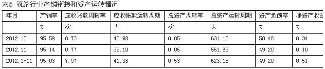 5氨綸行業(yè)產(chǎn)銷(xiāo)銜接和資產(chǎn)運(yùn)轉(zhuǎn)情況 從產(chǎn)銷(xiāo)銜接情況看,2012年1-11月份氨綸行業(yè)產(chǎn)銷(xiāo)率為95.03%,表明該行業(yè)產(chǎn)品銷(xiāo)售狀況較好;應(yīng)收賬款周轉(zhuǎn)率(主營(yíng)收入/應(yīng)收賬款凈額)為7.97次;應(yīng)收賬款運(yùn)轉(zhuǎn)周期(330天/應(yīng)收賬款周轉(zhuǎn)率)為41.38天,應(yīng)收賬款周轉(zhuǎn)次數(shù)越多,或者應(yīng)收賬款周轉(zhuǎn)天數(shù)越少,表明其實(shí)現(xiàn)利潤(rùn)的通道越加通暢。 從資產(chǎn)運(yùn)轉(zhuǎn)情況看,氨綸行業(yè)總資產(chǎn)周轉(zhuǎn)率(主營(yíng)收入/資產(chǎn)合計(jì))2012年1-11月份為0.53次,總資產(chǎn)運(yùn)轉(zhuǎn)周期(330天/總資產(chǎn)周轉(zhuǎn)率)為623.18天,總資產(chǎn)周轉(zhuǎn)次數(shù)越多,或者總資產(chǎn)周轉(zhuǎn)天數(shù)越少,表明資產(chǎn)利用效率越高。 氨綸行業(yè)資產(chǎn)負(fù)債率2012年1-11月份為49.20%,表明財(cái)務(wù)政策的運(yùn)作比較穩(wěn)?。粌糍Y產(chǎn)收益率為0.51%,表明該行業(yè)凈資產(chǎn)運(yùn)作效率一般。