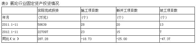 9氨綸行業(yè)固定資產(chǎn)投資情況 據(jù)國(guó)家統(tǒng)計(jì)局公布的數(shù)據(jù),2012年1-11月份氨綸行業(yè)實(shí)際完成投資額22.71億元,同比增加287.28%;當(dāng)年以來(lái)到目前為止施工項(xiàng)目總數(shù)為23個(gè),同比減少18.73%;其中新開(kāi)工項(xiàng)目數(shù)15個(gè),同比減少25.00%;截至11月底為止,已實(shí)現(xiàn)竣工項(xiàng)目數(shù)7個(gè),同比減少47.37%,占施工項(xiàng)目總數(shù)的30.43%,表明該行業(yè)投資項(xiàng)目進(jìn)展較好。