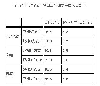 從產(chǎn)品類別看,上半年我國累計進口棉花241萬噸,同比下降21%,棉花進口額為46.8億美元,同比下降35%。從單價變化上看,今年上半年棉花進口單價要低于去年同期。進口數(shù)量同比表現(xiàn)為負增長,一方面原因是2012年進口棉花數(shù)量基數(shù)大,其次是因為一些紡織企業(yè)每月拿到的配額數(shù)量較小,可能會集中使用。今年首次實施配額與儲備棉購買量掛鉤的政策,從今年7月以前拍儲進度來看,25%左右的國儲棉成交率也導致了配額發(fā)放進度緩慢,從總量上看,截至7月底,2013年發(fā)放的配額數(shù)量要少于2012年。