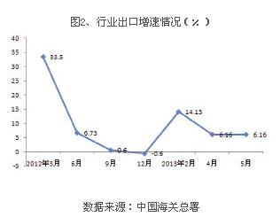 自2012年上半年開始,出口增速持續(xù)下滑,全年則輕微下降;2013年后,增速有所反彈,但是隨之又出現(xiàn)下降,見圖2。1~5月,產(chǎn)業(yè)用紡織品行業(yè)出口79.7億美元,同比增長6.16%,增速與去年同期基本持平。