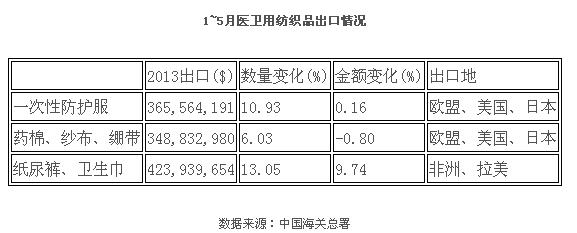 醫(yī)用出口比重高,但是由于經(jīng)濟(jì)復(fù)蘇乏力,國際客戶對價(jià)格更為敏感,出口價(jià)格進(jìn)一步走低。1~5月,我國合計(jì)出口各類醫(yī)療衛(wèi)生用紡織品11.4億美元,同比僅增長了3.21%。其中主要出口發(fā)展中國家、地區(qū)的紙尿褲、衛(wèi)生巾的出口增速較高。一次性防護(hù)服和醫(yī)用敷料的增長基本處于停滯狀態(tài)。數(shù)量是推動出口的主要因素?! ?/p>