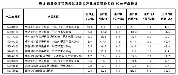 天然纖維類產(chǎn)品 對(duì)東南亞國家出口額回落 今年前三季度,我國天然纖維類產(chǎn)品主要出口市場(chǎng)為中國香港、越南和孟加拉國,對(duì)以上三市場(chǎng)出口額合計(jì)占同期天然纖維類產(chǎn)品出口總額的30.6%,出口額分別為23.4億美元、18.9億美元和16.6億美元,同比分別下降19.8%、12.8%和2%。 可以看出,受國際形勢(shì)及產(chǎn)業(yè)影響,今年紡織業(yè)國際間產(chǎn)業(yè)轉(zhuǎn)移所帶動(dòng)的我國對(duì)越南、孟加拉等低勞動(dòng)力成本國家出口天然纖維類原料需求的高速增長(zhǎng)已經(jīng)有所放緩。 從天然纖維類產(chǎn)品出口主要品種看,排名居前10位的品種出口額均超過4億美元。(詳見表2)