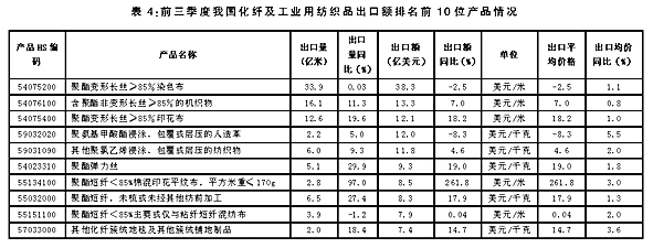 化纖及工業(yè)用紡織品 越南及歐美為我國主要出口市場(chǎng) 今年前三季度,我國化纖及工業(yè)用紡織品產(chǎn)品出口額330.4億美元,比去年同期增長(zhǎng)7.9%,其中對(duì)歐盟出口36.8億美元,同比增長(zhǎng)16.6%;對(duì)越南出口30億美元,同比增長(zhǎng)43.6%;對(duì)美國出口19.6億美元,同比增長(zhǎng)9.8%。對(duì)以上三大市場(chǎng)出口額合計(jì)占同期我國化纖及工業(yè)用紡織品出口總額的26.1%。 從化纖及工業(yè)用紡織品出口的主要品種來看,聚酯類品種出口額居前。(詳見表4)
