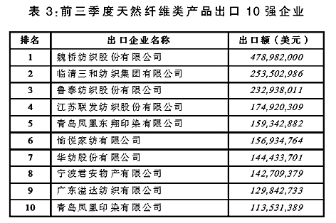 從出口企業(yè)情況來看,我國天然纖維類產(chǎn)品出口集中度日漸趨低,前三季度出口額排名前10位企業(yè)出口額合計(jì)僅占同期出口總額的9.3%。(詳見表3)
