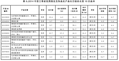 服裝及飾品類產(chǎn)品 日本市場(chǎng)出口繼續(xù)回落,棉質(zhì)服裝為主要出口品種 今年前三季度,我國服裝及飾品類產(chǎn)品出口額為1648.3億美元,比去年同期增長(zhǎng)6.8%。其中,對(duì)歐盟出口為385.6億美元,同比增長(zhǎng)18.1%;同期對(duì)美國和日本市場(chǎng)分別出口292.2億美元和162.2億美元,同比分別增長(zhǎng)7.5%和下降9.5%。對(duì)以上三大市場(chǎng)出口額合計(jì)占同期我國服裝及飾品類產(chǎn)品出口總額的51%。 從出口主要品種來看,主要以棉質(zhì)類服裝為主。(詳見表6)