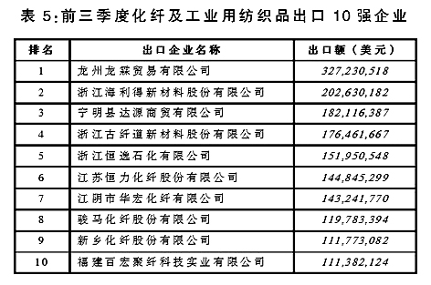 從出口企業(yè)情況來看,我國化纖及工業(yè)用紡織品產(chǎn)品出口集中度較低,出口額排名前10位企業(yè)出口額合計(jì)僅占同期出口總額的5%。(詳見表5)