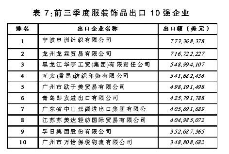 從出口企業(yè)情況來看,我國服裝及飾品類產(chǎn)品出口集中度與紡織原料類產(chǎn)品相比更為分散,出口額排名前10位企業(yè)出口額合計(jì)僅占同期出口總額的3.9%。(詳見表7)