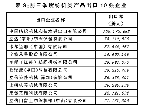 從出口企業(yè)情況來看,我國紡織機(jī)械類產(chǎn)品出口額排名前10位企業(yè)出口額合計(jì)占同期我國紡織機(jī)械類產(chǎn)品出口總額的16.7%。(詳見表9)