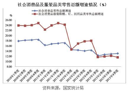 國家統(tǒng)計局數(shù)據(jù)顯示,2013年,社會消費品零售總額234380億元,比2012年名義增長13.1%(扣除價格因素實際增長11.5%),增速比2012年同期回落1.2個百分點。其中,限額以上企業(yè)(單位)消費品零售額118885億元,同比增長11.6%,比2012年同期增速回落3個百分點。服裝鞋帽、針紡織品類商品零售額累計實現(xiàn)11414億元,同比增長11.6%,比2012年同期增速回落6.4個百分點。