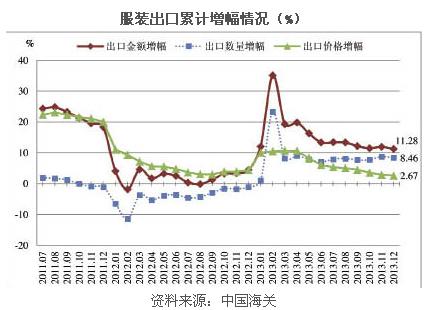 經濟溫和復蘇促使市場需求部分恢復,2013年,我國服裝出口金額和出口數(shù)量增速較2012年均有較大幅度提高。同時,對發(fā)達市場出口依賴程度降低,出口地區(qū)布局更趨多元,出口單價持續(xù)提升等特征進一步凸顯。