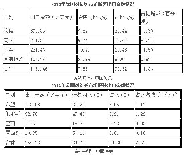 據(jù)海關總署數(shù)據(jù),2013年,我國對歐盟、美國、日本、香港地區(qū)4個傳統(tǒng)市場的出口金額總計為1039.46億美元,同比增長7.85%,占全國服裝出口總額的58.32%,份額減少1.86個百分點;出口數(shù)量為171.77億件,同比增長6.46%,占全國服裝出口總量的54.77%,份額減少1.03個百分點。而對新興市場出口服裝金額和數(shù)量的比重,則分別較2012年同期增加2.59和2.79個百分點。