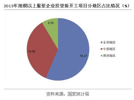 從投資項目來看,2013年,服裝行業(yè)規(guī)模以上企業(yè)施工項目7198個,同比增長3.67%;新開工項目5483個,同比增長6.24%;竣工項目5115個,同比增長4.28%。東部地區(qū)仍然為新開工項目投資重點地區(qū),占全國新開工項目總數(shù)量的56.43%,中部地區(qū)、西部地區(qū)分別占比34.98%和8.59%。