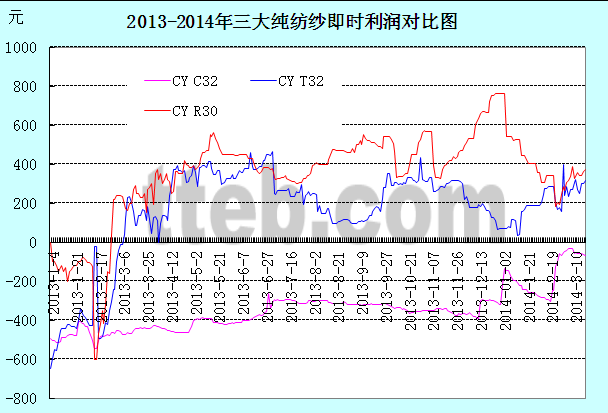 如圖所示,2013年以來(lái)三大純紡紗線利潤(rùn)水平差異較大,按現(xiàn)買(mǎi)現(xiàn)做整體來(lái)核算,純棉紗長(zhǎng)期處于虧損狀態(tài),而人棉紗和純滌紗多數(shù)時(shí)間保持盈利狀態(tài),截止目前,純棉紗價(jià)格水平處于盈虧邊緣線,而純滌紗和人棉紗仍有200-300元的利潤(rùn)水平。而反觀混紡紗,利潤(rùn)水平則相對(duì)客觀;