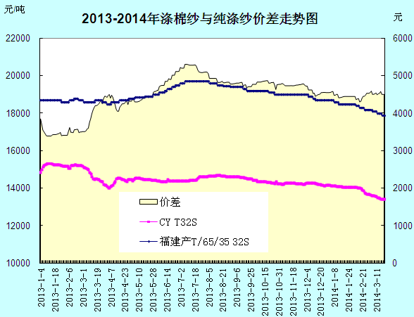 由圖可見(jiàn),2013年以來(lái)國(guó)內(nèi)滌棉紗價(jià)格整體呈現(xiàn)震蕩下行態(tài)勢(shì)。其中,中國(guó)紗線指數(shù)CYT32S價(jià)格當(dāng)時(shí)的14850元/噸累計(jì)下滑1450元至當(dāng)前的13400,跌幅9.76%,而具有代表性意義的福建產(chǎn)滌棉紗T65/C35T32S價(jià)格從18700元/噸累計(jì)下滑800元至17900左右,跌幅4.28%,降幅不到純滌紗的一半,顯示滌棉紗相對(duì)抗跌,而兩者價(jià)差也有之前的3850元擴(kuò)大到當(dāng)前的4500元左右。價(jià)格拉大使得滌棉紗與純滌紗的替代效應(yīng)逐漸削弱。