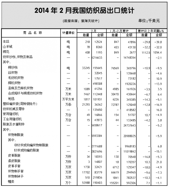 2014年2月全國(guó)紡織品服裝進(jìn)出口形勢(shì)概述