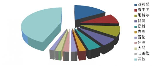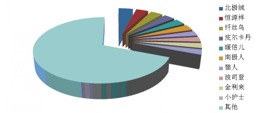 3、羽絨服:前十位品牌市場綜合占有率合計(jì)為55.9% 根據(jù)中華全國商業(yè)信息中心的統(tǒng)計(jì),2014年1月,全國重點(diǎn)大型零售企業(yè)羽絨服銷售前十位品牌市場綜合占有率合計(jì)為55.9%,波司登、雪中飛和坦博爾占據(jù)前三位。