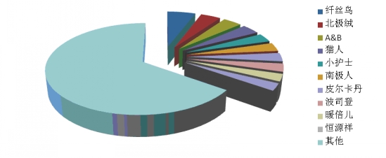 6、保暖內(nèi)衣:前十位品牌市場綜合占有率合計(jì)為34.7% 根據(jù)中華全國商業(yè)信息中心的統(tǒng)計(jì),2014年1月,全國重點(diǎn)大型零售企業(yè)保暖內(nèi)衣銷售前十位品牌市場綜合占有率合計(jì)為34.7%,纖絲鳥、北極絨和A&B占據(jù)前三位。