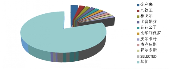4、茄克衫:前十位品牌市場綜合占有率合計(jì)為20.3% 根據(jù)中華全國商業(yè)信息中心的統(tǒng)計(jì),2014年1月份全國重點(diǎn)大型零售企業(yè)茄克衫銷售前十位品牌市場綜合占有率合計(jì)為20.3%,前三位依次是七匹狼、杰克瓊斯和雅戈?duì)枴?/p>