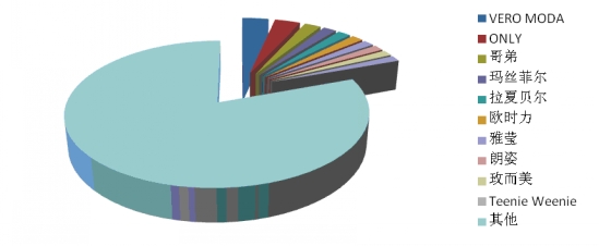 3、女裝:前十位品牌市場綜合占有率合計(jì)為19.4% 根據(jù)中華全國商業(yè)信息中心的統(tǒng)計(jì),2014年2月,全國重點(diǎn)大型零售企業(yè)女裝銷售前十位品牌市場綜合占有率合計(jì)為19.4%,VERO MODA、ONLY和哥弟占據(jù)前三位。