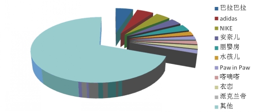 4、童裝:前十位品牌市場綜合占有率合計(jì)為30.5% 根據(jù)中華全國商業(yè)信息中心的統(tǒng)計(jì),2014年2月份全國重點(diǎn)大型零售企業(yè)童裝銷售前十位品牌市場綜合占有率合計(jì)為32.8%,前三位依次是巴拉巴拉、adidas和NIKE。