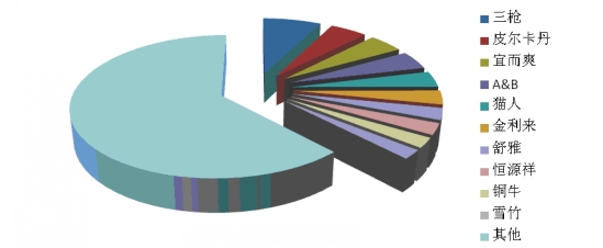 5、棉毛衫褲:前十位品牌市場綜合占有率合計(jì)為37.7% 根據(jù)中華全國商業(yè)信息中心的統(tǒng)計(jì),2014年2月份全國重點(diǎn)大型零售企業(yè)棉毛衫褲銷售前十位品牌市場綜合占有率合計(jì)為37.7%,三槍占據(jù)榜首位置,皮爾卡丹和宜而爽分列第二和第三位。