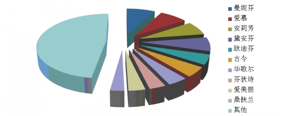 6、女性內(nèi)衣:前十位品牌市場綜合占有率合計(jì)為52.3% 根據(jù)中華全國商業(yè)信息中心的統(tǒng)計(jì),2014年2月,全國重點(diǎn)大型零售企業(yè)女性內(nèi)衣銷售前十位品牌市場綜合占有率合計(jì)為52.3%,曼妮芬、愛慕和安莉芳占據(jù)前三位。