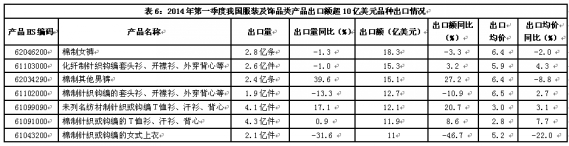 從出口主要品種看,主要以棉質類服裝為主。今年第一季度出口額超10億美元的品種共有7種,見表6。