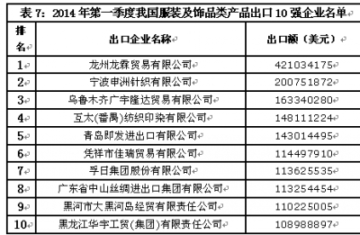 從出口企業(yè)情況來看,我國服裝及飾品類產品出口集中度與紡織原料類產品相比更為分散,出口額排名前10位企業(yè)出口額合計僅占同期出口總額的3.9%,今年第一季度出口10強企業(yè)名單見表7。