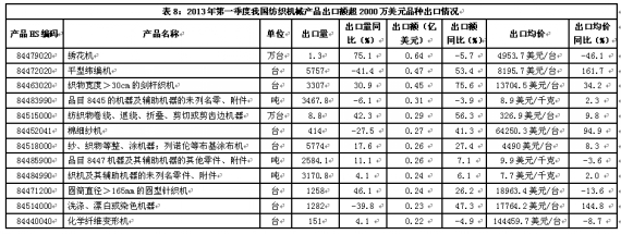 今年第一季度,我國紡織機械產品共出口6.6億美元,同比增長21.5%。其中,對印度出口1.1億美元,增長8.7%,對越南出口8631萬美元,增長38.5%。對以上兩市場出口額合計占同期紡織機械類產品出口總額的29.1%。出口額超2000萬美元的主要品種出口情況如表8所示。