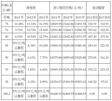 隨著我國(guó)成功加入WTO,紡織業(yè)走出國(guó)門,我國(guó)紡織產(chǎn)業(yè)得到快速發(fā)展,用棉需求快速增長(zhǎng)。2003年,我國(guó)棉花自給自足的狀況開始出現(xiàn)明顯反轉(zhuǎn),棉花供不應(yīng)求現(xiàn)象突出。國(guó)家為彌補(bǔ)國(guó)內(nèi)供需缺口,開始向國(guó)內(nèi)投放配額棉花,2003/2004年度我國(guó)棉花進(jìn)口除關(guān)稅內(nèi)的配額89.4萬(wàn)噸以外,還追加了150萬(wàn)噸。 在緩和國(guó)內(nèi)用棉缺口的同時(shí),棉花進(jìn)口配額的增加及低價(jià)棉的大量進(jìn)口不僅壓低了國(guó)內(nèi)的棉價(jià),也使國(guó)內(nèi)棉花經(jīng)銷商和棉農(nóng)的利益受損。2003年,我國(guó)棉花價(jià)格比美國(guó)同等級(jí)棉花價(jià)格高出50%。大量追加的配額棉花促使國(guó)內(nèi)棉花價(jià)格大幅下挫,2004年我國(guó)棉花收購(gòu)價(jià)格相比2003年下降27%,這也成為我國(guó)棉花市場(chǎng)運(yùn)行以來最大幅度的一次價(jià)格波動(dòng)。 面對(duì)棉價(jià)的大幅度變化,為了保持國(guó)內(nèi)市場(chǎng)價(jià)格的相對(duì)穩(wěn)定,避免低價(jià)進(jìn)口棉花沖擊國(guó)內(nèi)棉花價(jià)格,保護(hù)棉農(nóng)利益,國(guó)家從2005年開始對(duì)進(jìn)口棉花征收5%一45%的滑準(zhǔn)稅。 根據(jù)公式對(duì)比,2012年進(jìn)口滑準(zhǔn)稅起征價(jià)格上調(diào),由2011年的11397元/噸調(diào)至14000元/噸,上漲幅度達(dá)22.8%。起征價(jià)格上調(diào)意味著變相增加進(jìn)口棉的成本。相比2012年,雖然2013年進(jìn)口滑準(zhǔn)稅起征價(jià)格不變,但滑準(zhǔn)稅率公式改變,滑準(zhǔn)稅系數(shù)一增一減,棉花滑準(zhǔn)稅依舊出現(xiàn)上漲趨勢(shì)。 綜上所述,實(shí)施滑準(zhǔn)稅后,我國(guó)進(jìn)口棉花價(jià)格逐年上漲,不過增長(zhǎng)幅度放緩,2012年增長(zhǎng)幅度為2.58%,2013年增長(zhǎng)幅度為2.53%。 滑準(zhǔn)稅對(duì)國(guó)內(nèi)棉花價(jià)格的影響