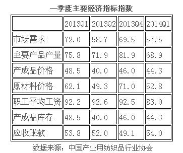 今年一季度我國產(chǎn)業(yè)用紡織品行業(yè)開局良好,銷售、利潤和投資均繼續(xù)保持快速增長,經(jīng)濟效益持續(xù)好轉(zhuǎn);同時受美國和歐盟市場需求增長的帶動,出口保持了6.57%的增速。根據(jù)協(xié)會調(diào)研,一季度企業(yè)的景氣指數(shù)為78.3,比去年同期略有增長,企業(yè)對今年全年的預(yù)期信心指數(shù)為80.1,比2013年有所回升,這些均表明企業(yè)對當(dāng)期的經(jīng)營狀況比較滿意,同時對全年的業(yè)績也有比較好的預(yù)期。
