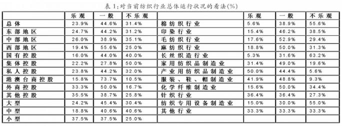 表1:對當前紡織行業(yè)總體運行狀況的看法(%)