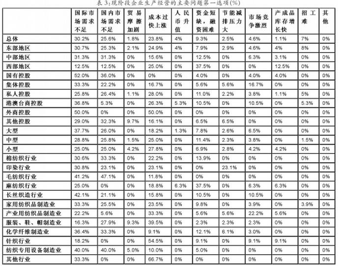 表3:現(xiàn)階段企業(yè)生產(chǎn)經(jīng)營的主要問題第一選項(%)