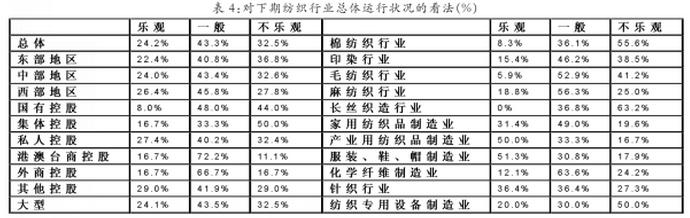 表4:對下期紡織行業(yè)總體運行狀況的看法(%)