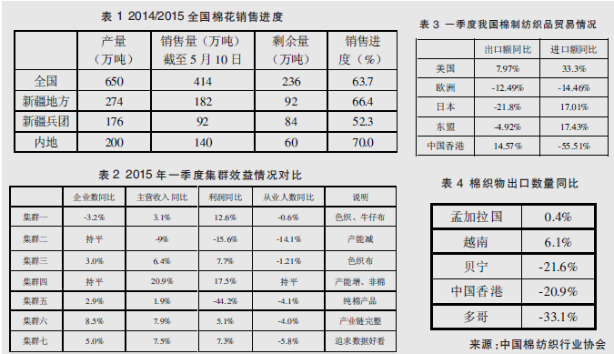根據(jù)中國棉紡織行業(yè)協(xié)會跟蹤企業(yè)調(diào)查顯示,2015年一季度末,棉紡織行業(yè)紡紗、織布生產(chǎn)正常,紗、布產(chǎn)量同比增長。當前,我國的紡織企業(yè)經(jīng)營困難依舊,但好于去年同期,信心逐漸恢復,個別集群企業(yè)從開工到效益均好于去年同期。