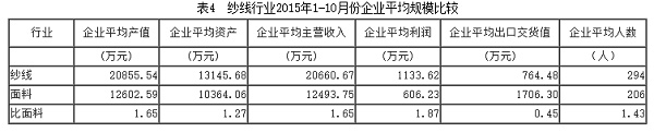 從企業(yè)平均規(guī)模的比較看,2015年1-10月份紗線企業(yè)平均產(chǎn)值為20855.54萬元,為面料行業(yè)平均數(shù)的1.65倍;企業(yè)平均資產(chǎn)為13146萬元,為面料行業(yè)平均數(shù)的1.27倍;企業(yè)平均主營(yíng)收入為20660.7萬元,為面料行業(yè)平均數(shù)的1.65倍;企業(yè)平均利潤(rùn)為1133.62萬元,為面料行業(yè)平均數(shù)的1.87倍;企業(yè)平均出口交貨值為764.48萬元,為面料行業(yè)平均數(shù)的0.45倍;企業(yè)平均人數(shù)為294人,為面料行業(yè)平均數(shù)的1.43倍。由此可見,在紗線行業(yè)中,企業(yè)平均規(guī)模略高于面料行業(yè)的平均規(guī)模。