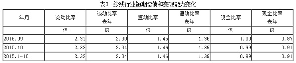 從短期償債和變現(xiàn)能力的變化看,紗線行業(yè)流動(dòng)比率(流動(dòng)資產(chǎn)/流動(dòng)負(fù)債)2015年1-10月份為2.32倍,而上年同期為2.34倍,流動(dòng)比率較高,表明企業(yè)短期償債能力較強(qiáng);