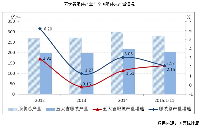 2015年1-11月,我國服裝產(chǎn)量前五名廣東、江蘇、福建、浙江和山東省服裝總產(chǎn)量達(dá)202.75億,同比增長2.17%,五省服裝總產(chǎn)量占全國總產(chǎn)量的比重為72.72%。2012年以來,五省服裝總產(chǎn)量占全國總產(chǎn)量的比重一直保持在72%-75%,傳統(tǒng)服裝生產(chǎn)大省對(duì)全國服裝生產(chǎn)的穩(wěn)定器作用十分明顯。